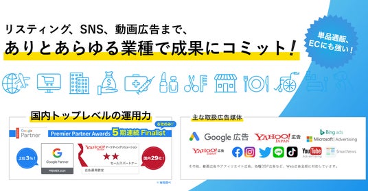 累計アカウント数2,120件、運用アカウント数495件の豊富なWeb広告運用実績と、GoogleやYahoo!に認められた確かな広告運用力があります。Googleが主催する「Premier Partner Awards」では、5期連続の国内ファイナリストに選出されており(※1)、また、LINEヤフー Sales Partnerでは、約900社の中から、さらに優れた実績を持つ約20社だけに付与される(上位2.3%のステータス)特別な認定を受けています(※2)。