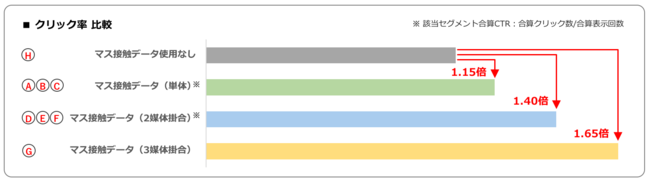 テスト配信の結果、マス接触データを使用しないセグメントHと比較して、7つのターゲットセグメントではすべて広告のクリック率が向上しました。最もクリック率が高かったのは、3マス媒体の接触データをすべて活用したセグメントGで、セグメントHと比較して1.65倍になりました。また、2つのデータをかけ合わせたセグメントD、E、Fにおいても1.40倍と効果が見られました。また、旅行に関する番組が多く放送されるテレビ接触データを活用したセグメントA、D、Eが特に有効であるとの結果も得られました。業種や商材、もしくは広告主の達成目標によって、A~Gの各セグメントを使い分けることで、最適な提案を実施することが可能になったと考えられます。