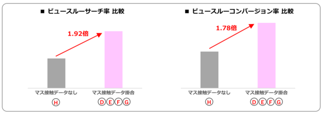 直接クリックに結びつかなくても、広告そのものに効果があったことを示す間接的な指標においても、マス接触データをかけ合わせて活用したセグメントD~Gの方が、使用しなかった場合(H)に比べ、高い結果が得られました。検索行動への貢献度合いを示すビュースルーサーチ率では1.92倍、購買への貢献度を示すビュースルーコンバージョン率では1.78倍となりました。複数のマス接触データを組み合わせることで、より興味関心度の高いユーザーに効率よくリーチできることを示していると考えられます。