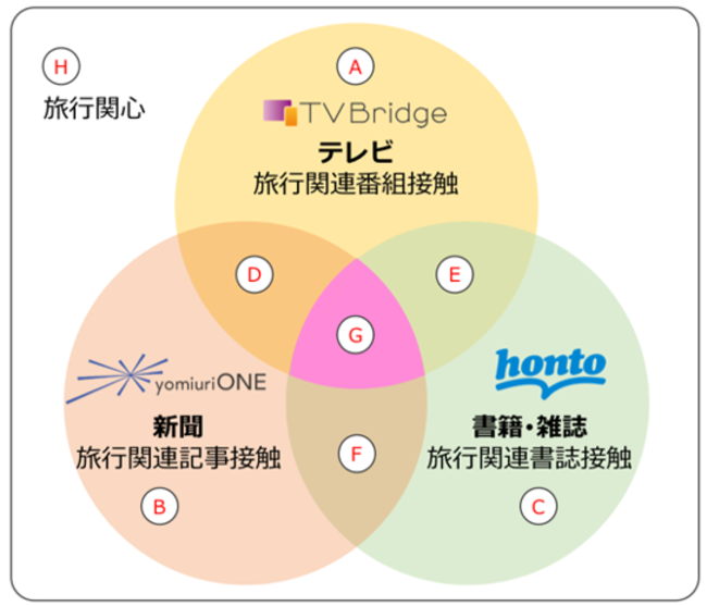 今回のサービス開始に先立って実施したテスト配信では、旅行会社の広告配信キャンペーンにおいて、「yomiuri ONE」、「honto」アクセスデータ、「TVBridge」の掛け合わせパターンに応じて、A~Gの7つのターゲットセグメントを設定。マス接触データを使用しない興味関心ターゲティングであるセグメントHと比較して、広告配信結果がどの程度向上するか検証しました。主な結果は次のとおりです。