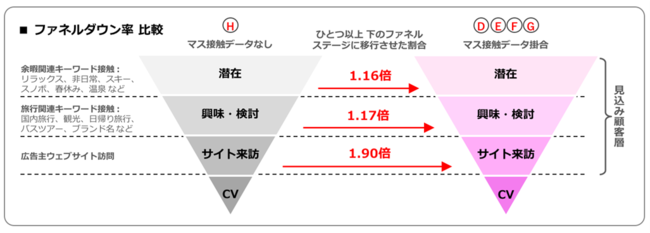 「Media X」はマス接触データを用いることにより、これまで以上に効果的なターゲティング広告配信を実現いたします。サービス開始に先立って実施したテスト配信の結果、マス接触データを用いて設定したセグメントでは、同データを用いないセグメントと比べ、広告のクリック率、ビュースルーサーチ率(*1)、ビュースルーコンバージョン率(*2)並びにユーザーのファネルダウン率が高くなることを確認いたしました。