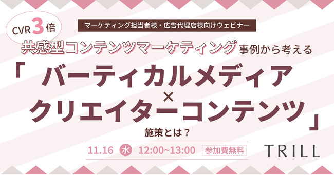 月間利用者数5,500万人を誇る国内No.1のライフスタイルプラットフォーム「TRILL」(※1)は、2022年11月16日(水) 12:00~13:00に『CVR3倍!共感型コンテンツマーケティング事例』について無料のウェビナーを開催します。
