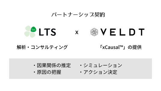 「xCausal(TM)」は、データをアップロードするだけで使える、使いやすさを重視したSaaS型のコーザルAI(因果関係ベースのAI)プラットフォームです。因果関係の発見に寄与するデータの選定や利用のノウハウは業種や領域ごとに異なっており、そうした専門知識の活用が、原因究明の確度を上げる上で重要な要素となっています。今回のパートナーシップ契約によりLTSは、企業・官公庁などさまざまなお客様へのコンサルティングサービスによって蓄積した専門知識とデータ、ヴェルトの知見、「xCausal(TM)」を活用し、相関関係の分析では解決が難しかった課題の解決策や新たな価値を提供します。