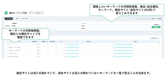 「競合キーワード分析」機能で競合が上位を獲得しているキーワードを確認し、その中で自社が獲得できていないキーワードから対策を実施。