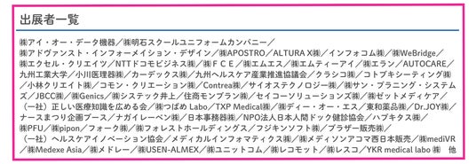 出展製品サービス:医療情報システム、医療機器、健診・健康増進、看護、施設環境・運営サポート、介護・福祉・リハビリ