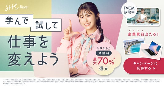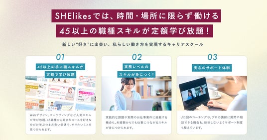 SHElikesは、時間や場所にとらわれずに働ける45以上の職種スキルが定額で学び放題の女性のためのキャリアスクールです。Webデザイン・Webマーケティング・ライティングなど、パソコンひとつで働けるデジタルスキルやクリエイティブスキルを幅広く学べ、私らしい働き方の実現を支援します。