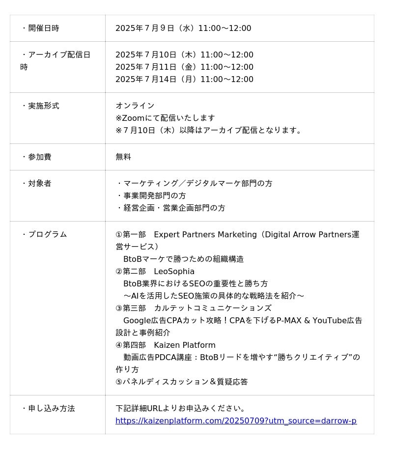 株式会社TWOSTONE&Sonsの100%子会社である株式会社Digital Arrow Partners(所在地:東京都渋谷区、代表取締役CEO:道家康貴、以下 Digital Arrow Partners)は、2025年7月9日(水)に株式会社LeoSophia(本社:東京都目黒区、代表者:永崎太一、以下 LeoSophia)、株式会社カルテットコミュニケーションズ(本社:愛知県名古屋市、代表取締役:堤大輔、以下 カルテットコミュニケーションズ)、株式会社Kaizen Platform(本社:東京都港区、代表取締役:須藤憲司、以下 Kaizen Platform)と4社共催でセミナーを開催することをお知らせいたします。