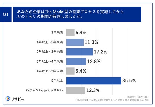 https://ideatech.jp/service/research-pr■BtoB企業の35.5%が、The Model型営業プロセスを実施してから「5年以上」経過 「Q1.あなたの企業はThe Model型の営業プロセスを実施してからどのくらいの期間が経過しましたか。」(n=203)と質問したところ、