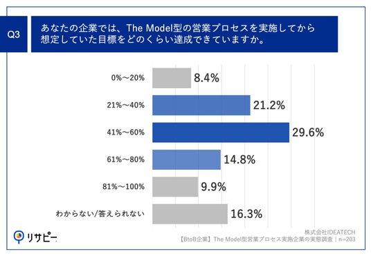 ■The Model型営業プロセスの目標達成状況は、「41%~60%」「21%~40%」が上位に 「Q3.あなたの企業では、The Model型の営業プロセスを実施してから想定していた目標をどのくらい達成できていますか。」(n=203)と質問したところ、