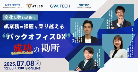 ワークフローシステムのリーディングカンパニーであるエイトレッド(本社:東京都渋谷区、代表取締役社長:岡本 康広 以下、エイトレッド)は、株式会社NTTデータビジネスブレインズ、GVA TECH株式会社、セイコーソリューションズ株式会社と共催でオンラインセミナー『変化に強い組織へ─紙業務の課題を乗り越える、バックオフィスDX成功の勘所』を2025年7月8日(火)に開催いたします。