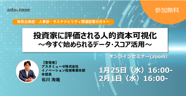 スタミューゼ株式会社(本社:東京都千代田区、代表取締役社長 永井歩)は、2月1日(水)16時~に、経営企画部、人事部、サステナビリティ部署、その他人的資本経営やIR開示に関わる業務に携わる方を対象とした無料ウェビナー「投資家に評価される人的資本可視化~今すぐ始められるデータ・スコア活用~」を開催いたします。好評につき日程を追加いたしました。
