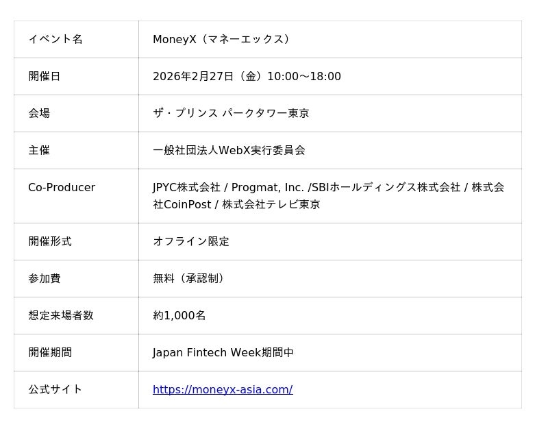 次世代カンファレンス「MoneyX(マネーエックス、以下本カンファレンス)」が2026年2月27日(金)ザ・プリンス パークタワー東京にて開催されます。