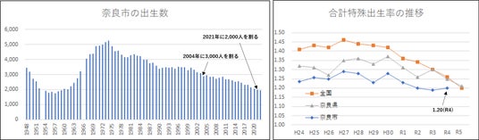 奈良市の出生数、合計特殊出生率の推移