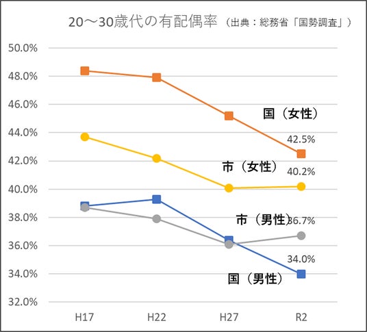 20~30歳代の有配偶率(出典:総務省「国勢調査」)
