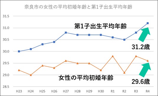 奈良市の女性の平均初婚年齢と第1子出生平均年齢