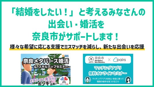 この結果を踏まえ、奈良市では、より内面を重視した婚活を行うことができ、すでに他自治体において高いマッチング結果を出しているメタバース婚活と、近年利用が増加するマッチングアプリの活用セミナーを実施することで、出会いの場の提供に加え、セミナー等により自己表現力・対話力のスキルアップなど、様々な希望に対応する支援を通して、新たな出会いに向けて踏み出すみなさんを応援します。