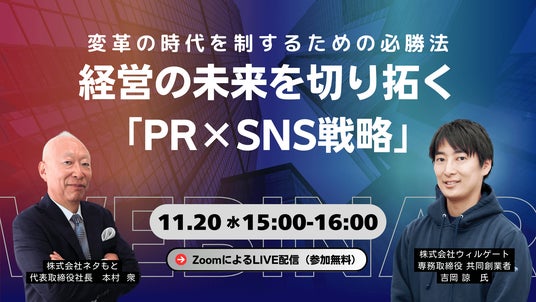 株式会社ウィルゲート(本社:東京都港区、代表取締役:小島 梨揮、以下 ウィルゲート)は、株式会社ネタもと(本社:東京都港区、代表取締役社長:本村 衆)と共同で、無料オンラインセミナー『変革の時代を制するための必勝法!経営の未来を切り拓く「PR×SNS戦略」』を11月20日(水)15時より開催いたします。(申込み先: