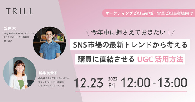 月間利用者数5,500万人を誇る国内No.1のライフスタイルプラットフォーム「TRILL」(※1)は、2022年12月23日(金)12:00~13:00に『SNS市場の最新トレンドから考える、購買に直結させるUGC活用方法』について無料のウェビナーを開催します。