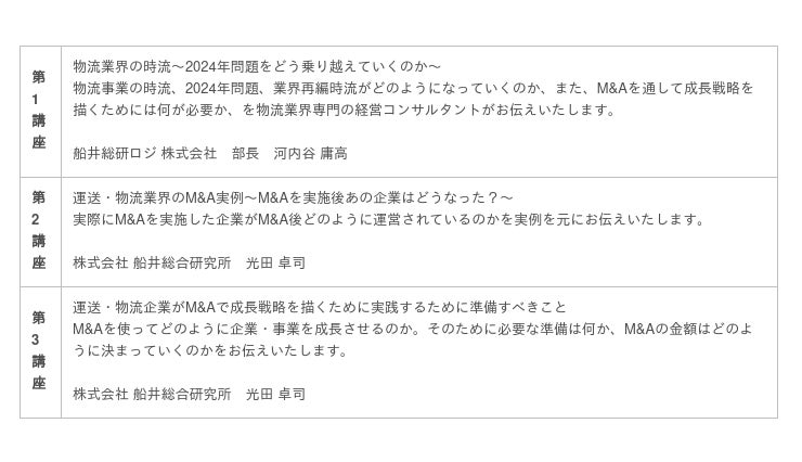 株式会社船井総合研究所が主催する『運送・物流業界向け M&Aフォーラム』に物流コンサル専門の船井総研ロジがゲスト出演いたします。 物流事業の時流、2024年問題、業界再編時流がどのようになっていくのか、また、M&Aを通して成長戦略を描くためには何が必要かを、物流のプロとM&Aのプロが事例を踏まえながらお伝えいたします。