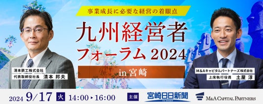 M&Aキャピタルパートナーズ株式会社(東京都中央区・代表取締役社長 中村 悟) は、宮崎日日新聞社との共催セミナー「九州経営者フォーラム2024 in 宮崎」を2024年9月17日(火)に開催いたします。急激な社会の変化に対して、宮崎県内の企業が今後どのように対応していかなければならないのか、事業を成長・発展させるための経営戦略についてお話させていただきます。
