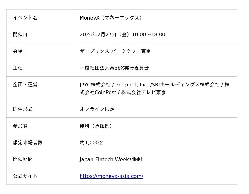 株式会社CoinPost次世代カンファレンス「MoneyX(マネーエックス、以下本カンファレンス)」が2026年2月27日(金)ザ・プリンス パークタワー東京にて開催されます。