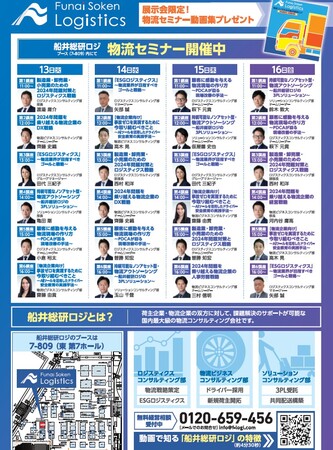 なお、展示会の会期中、船井総研ロジのブース内では全24回の物流セミナーを開催します。タイムスケジュールは下記の通りです。2024年問題をはじめ、ESG(脱炭素)・トラック事故ゼロなどをテーマに船井総研ロジのコンサルタントが講演いたします。