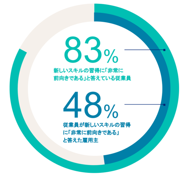 調査では、83%の従業員が新しいスキルの習得に強い意欲を持っていることが明らかになりましたが、従業員に意欲があると考えている雇用主は48%にとどまる結果に。また、学習の成果についても、81%の従業員が新しいスキルを定期的かつ効果的に活用していると考えているのに対し、雇用主は60%しか活用していると考えていないなど、認識の違いがあることがわかりました。