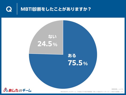 若い世代に人気の“MBTI診断”※。自分の性格や考え方、行動のタイプを知ってもらうためにSNSプロフィールに書いたりするほか、最近では適職選びの参考にするWEBコンテンツなども見られます。自分のMBTI診断をしたことが「ある」と回答した方は75.5%にのぼり、30歳以下の管理職の間ではMBTI診断はポピュラーであることがわかりました。