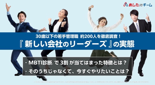 人事評価制度の構築・運用・クラウド化で “人と組織の成長” を支援する株式会社あしたのチーム(本社:東京都中央区、代表取締役社長 CEO:赤羽博行)は、国内中小企業の組織課題や実態の把握を目的に、30歳以下で管理職2~3年目の若手管理職「新しい会社のリーダーズに関する調査」を実施しました。