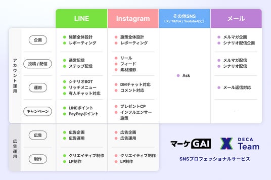 マーケティングDX支援サービス「DECA」においては、専門スペシャリストによるプロフェッショナルサービス「DECA Team」を提供しています。この度の「マーケGAI」の新機能追加に伴い、SNS向けのプロフェッショナルサービスをより効果的かつ、より安価に、アップデートいたしました。