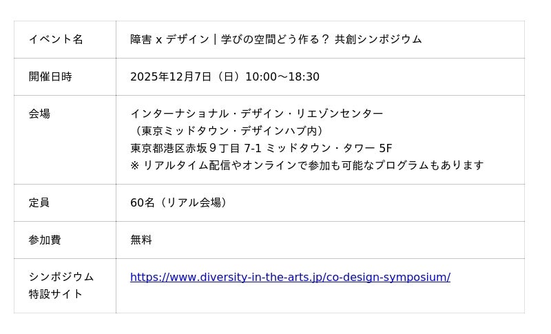 インクルーシブデザインスタジオCULUMU(運営:株式会社STYZ、本社:東京都渋谷区、代表取締役:田中辰也、以下「CULUMU」)は、2024年12月7日(日)に開催されるシンポジウム「障害 x デザイン|学びの空間どう作る? 共創シンポジウム」(主催:日本財団DIVERSITY IN THE ARTS、多摩美術大学、一般社団法人ドリフターズ・インターナショナル)の公式サイト制作に協力いたしました。