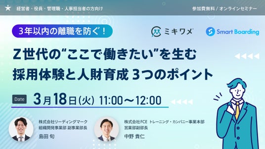 https://www.smartboarding.net/) を提供する株式会社FCE(本社:東京都新宿区、代表取締役社長:石川淳悦、東証上場/証券コード9564)は、Personality Techを通じ「採用のミスマッチ」と「従業員の離職」を減らし日本の生産性を上げるHR事業「ミキワメ」を提供する株式会社リーディングマーク(本社:東京都港区、代表取締役社長:飯田 悠司)と共催セミナーを開催いたします。