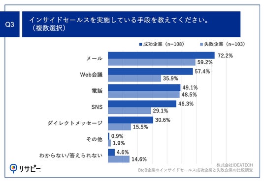「Q3.インサイドセールスを実施している手段を教えてください。(複数選択)」と質問したところ、成功企業(n=108)は