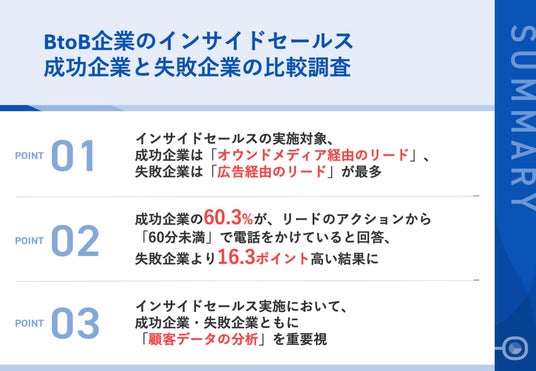 今回の調査では、インサイドセールスの成功企業と失敗企業の間で、インサイドセールスの実施対象や対応の迅速さに大きな差があることが明らかになりました。成功企業に倣い、今後の競争力向上には、より高品質なコンテンツ制作と迅速なフォローアップが成功の鍵となるでしょう。