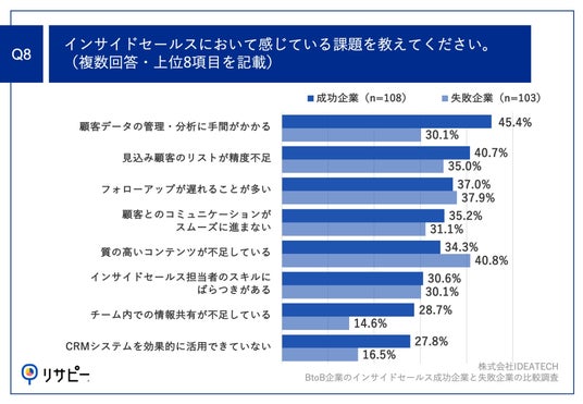 「Q8.インサイドセールスにおいて感じている課題を教えてください。(複数回答)」と質問したところ、成功企業(n=108)は