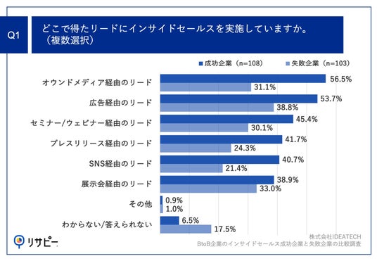 「Q1.どこで得たリードにインサイドセールスを実施していますか。(複数選択)」と質問したところ、成功企業(n=108)は