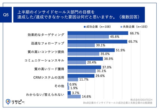 ワンストップでリサーチデータマーケティングを実現する「リサピー(R)️」(https://ideatech.jp/service/research-pr)を運営する株式会社IDEATECH(本社:東京都港区、代表取締役社長:石川友夫、以下:IDEATECH)は、2024年上半期の部門目標を100%以上達成した、BtoB企業のインサイドセールス担当者108名、2024年上半期の部門目標を達成できなかった、BtoB企業のインサイドセールス担当者103名を対象に、BtoB企業のインサイドセールス成功企業と失敗企業の比較調査を実施しましたので、お知らせいたします。