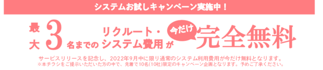 プレリリースに先行して特別に、先着10社様限定で【最大3名までのリクルーティング費用・システム利用費用】を無料でトライアルいただけます。キャンペーンをご希望の方は本メールへのご返信、もしくは担当営業までご一報くださいませ。