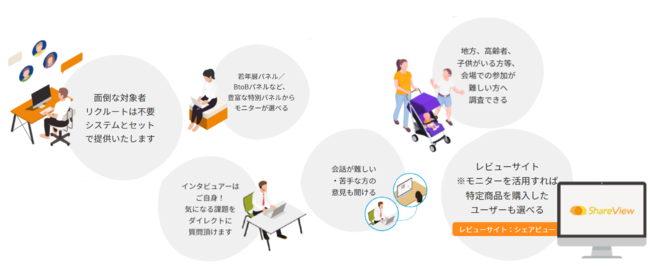 インタビュー会場(システム)の設定やモデレーターの手配は不要。 対象者の条件が決まっていれば、リクルート~チャットインタビューシステムのセットまで、ワンストップでご用意いたします。