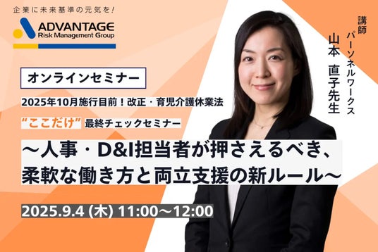 株式会社アドバンテッジリスクマネジメントは、2025年9月4日(木)に人事労務/両立支援のご担当者様・責任者様および産業保健スタッフを対象としたWebセミナー「2025年10月施行目前!改正・育児介護休業法“ここだけ”最終チェックセミナー~人事・D&I担当者が押さえるべき、柔軟な働き方と両立支援の新ルール~」を開催いたします。