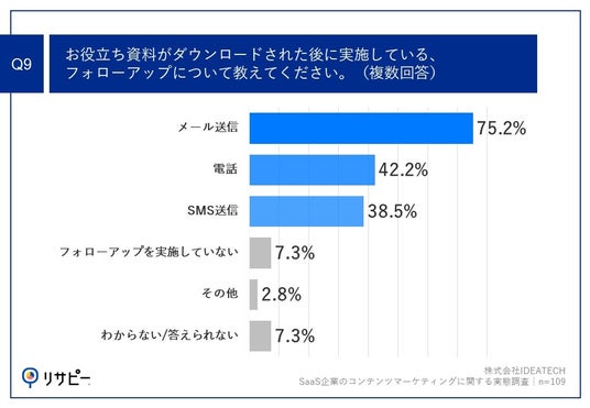 「Q9.お役立ち資料がダウンロードされた後に実施している、フォローアップについて教えてください。(複数回答)」(n=109)と質問したところ、