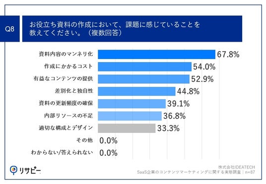「資料内容のマンネリ化」が67.8%、「作成にかかるコスト」が54.0%、「有益なコンテンツの提供」が52.9%という回答となりました。