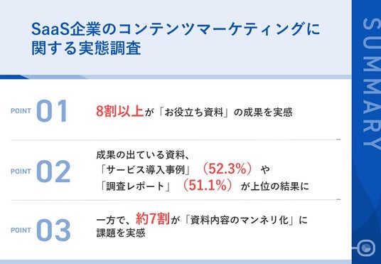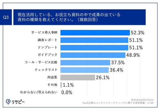 「サービス導入事例」が52.3%、「調査レポート」が51.1%、「テンプレート」が51.1%という回答となりました。