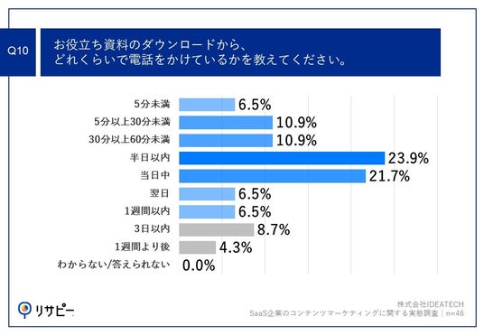 「Q10.お役立ち資料のダウンロードから、どれくらいで電話をかけているかを教えてください。」(n=46)と質問したところ、
