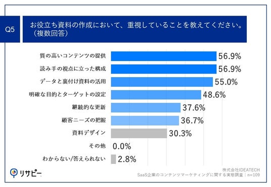 「Q5.お役立ち資料の作成において、重視していることを教えてください。(複数回答)」(n=109)と質問したところ、