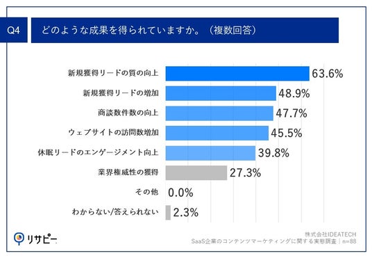 、「新規獲得リードの質の向上」が63.6%、「新規獲得リードの増加」が48.9%、「商談数件数の向上」が47.7%という回答となりました。