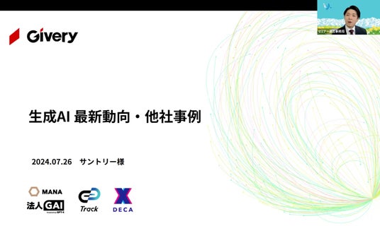 生成AIの法人活用推進と多角的なDX支援サービスを展開する株式会社ギブリー(本社:東京都渋谷区、代表取締役社長:井手高志、以下ギブリー)は、7月26日(金)にサントリーホールディングス株式会社(以下、サントリー)のグループ会社経営推進部が主催し、サントリーのグループ会社向けに実施したオンラインイベント「わかる!使える!ChatGPTセミナー」の企画制作に協力し、ギブリー取締役の山川雄志が講演しました。