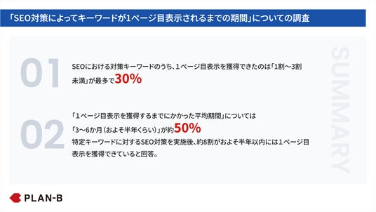 SEOツール「SEARCH WRITE」やSEOコンサルティングサービスを提供する株式会社PLAN-B(東京都品川区、代表取締役:鳥居本 真徳、以下「当社」)は、「SEO対策によってキーワードが1ページ目表示されるまでの期間」について調査を実施いたしました。