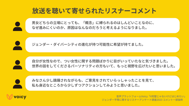 日本にはジェンダー平等に対する課題がまだまだ多い現状に対し、完璧じゃなくても、たとえ最初は誤解が生まれたとしても、はじめることに意義がある。そう考えて「#完璧じゃないけどはじめたい」をテーマにした音声特集を実施しました。トークテーマには多くのパーソナリティが参加し、それぞれの視点でジェンダー平等や女性活躍について語る放送を集めることができました。その声を多くのリスナーに届けることができたことは、Voicyとしても最初の一歩をはじめることができたのではないかと考えています。もちろん今回のアンケート調査結果からもわかるように、一度取り組んだだけではすべての人の意識や行動を変えられず、社会の変化のためには積み重ねが必要です。なめらかな明日のために、これからもVoicyとしてできることからひとつずつ向き合っていきたいと考えています。「#完璧じゃないけどはじめたい」の放送は、引き続きお聴きいただけます。特別対談を中心に、ぜひ聴いて気づきを得てみてはいかがでしょうか。