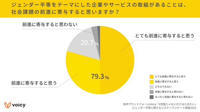 「この取り組みについて、どのように感じましたか?」という質問に対し、83.1%の人が「好感が持てる」と回答しました。また「ジェンダー平等をテーマにした企業やサービスの取組があることは、社会課題の前進に寄与すると思いますか?」に対し、79.3%の人が「前進に寄与すると思う」と回答しました。